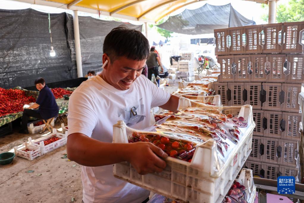 5月31日,來(lái)自安徽的客商卜九峰在燕崖鎮櫻桃交易市場(chǎng)內搬運櫻桃。