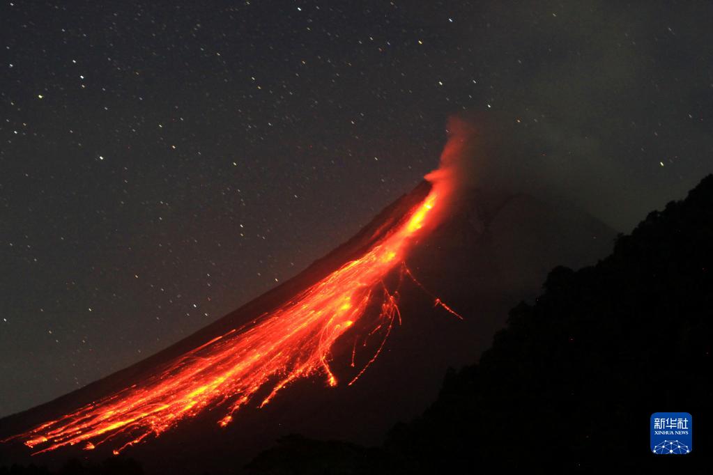 這是6月1日在印度尼西亞日惹拍攝的噴發(fā)中的默拉皮火山。