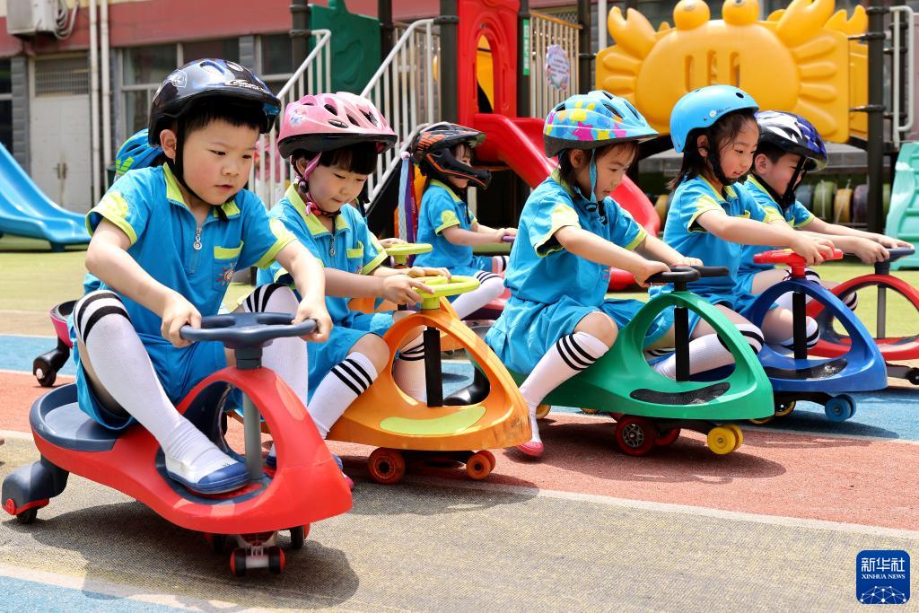6月1日,在山東省棗莊市文化路絲雨幼兒園,小朋友們在參加“扭扭車(chē)”趣味比賽。
