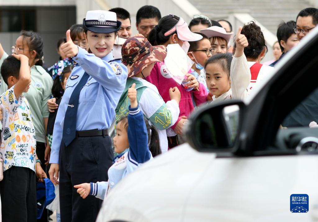 6月1日,在烏魯木齊市公安局交警支隊警營(yíng)開(kāi)放日活動(dòng)上,小朋友在民警的示范下學(xué)習如何正確穿過(guò)馬路。