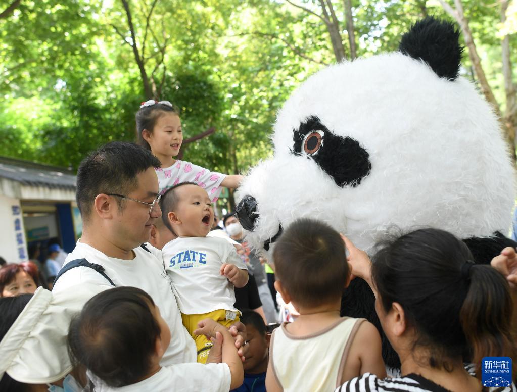 6月1日,在武漢市江岸區堤角公園,孩子們和熊貓人偶拍照互動(dòng)。
