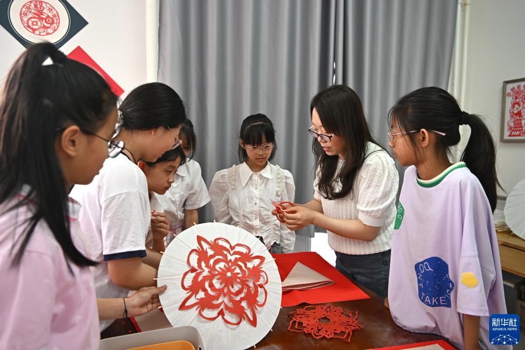 5月31日,中關(guān)村第三小學(xué)雄安校區美術(shù)老師高娜(右二)指導剪紙社團的學(xué)生們進(jìn)行剪紙創(chuàng )作。