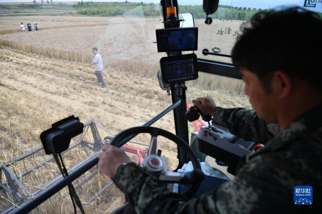 6月1日,農機手駕駛收割機在西安市長(cháng)安區王曲街道皇甫村的麥田內作業(yè)。