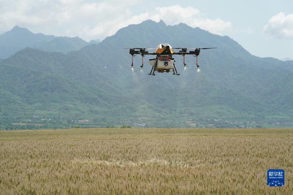 在西安市長(cháng)安區神禾塬萬(wàn)畝優(yōu)質(zhì)糧食生產(chǎn)基地,植保無(wú)人機進(jìn)行麥田植保作業(yè)(5月30日攝)。