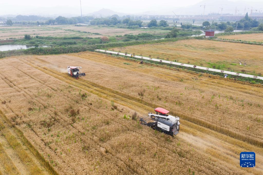 6月1日,在道場(chǎng)鄉施家橋村的麥田里,收割機在搶收小麥(無(wú)人機照片)。