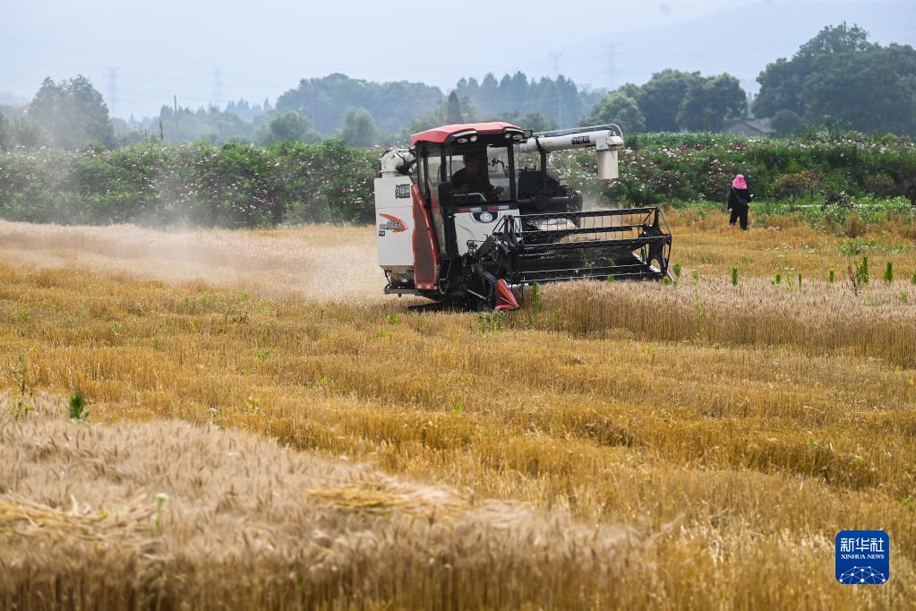 6月1日,在道場(chǎng)鄉施家橋村的麥田里,收割機在搶收小麥。