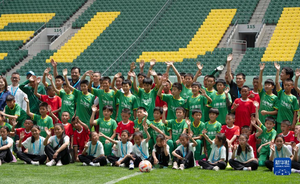 6月1日,在北京工人體育場(chǎng),藏族孩子與國安少年足球隊隊員和工作人員合影留念。