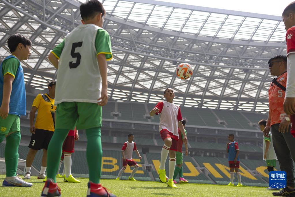 6月1日,在北京工人體育場(chǎng),藏族孩子與國安少年足球隊隊員訓練交流。
