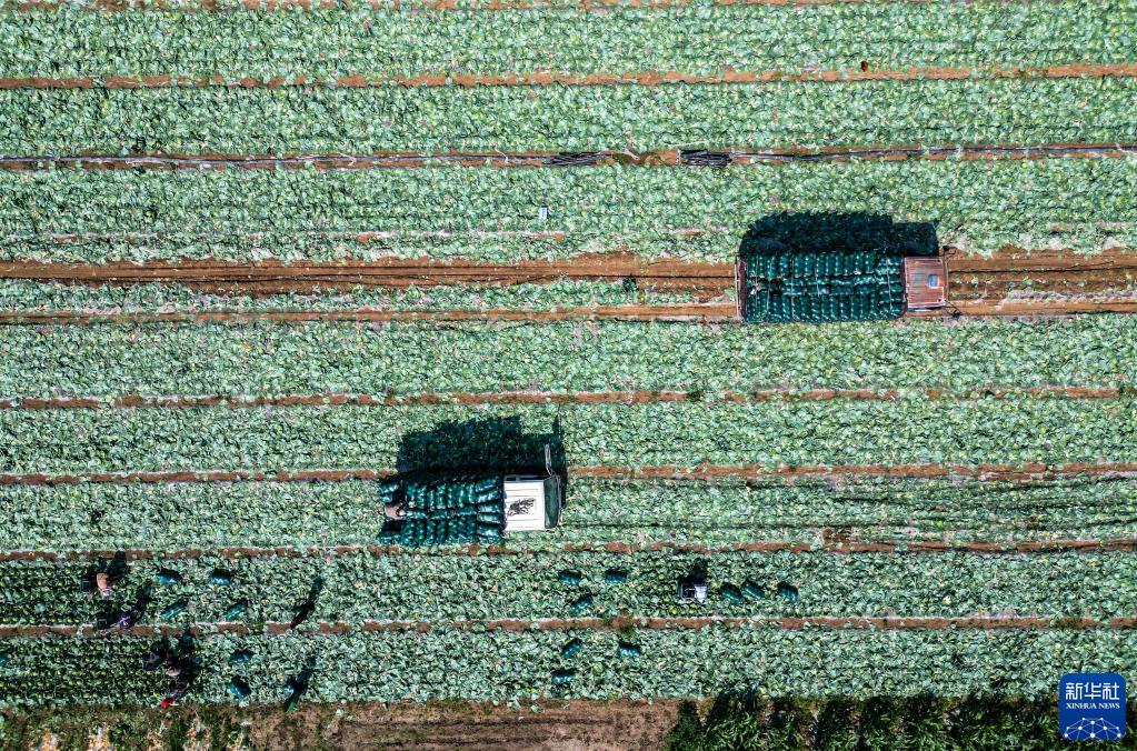 6月1日,農民在河北省玉田縣虹橋鎮一處供京蔬菜基地內將收獲的甘藍裝車(chē)(無(wú)人機照片)。
