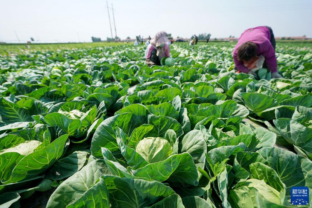6月1日,農民在河北省玉田縣虹橋鎮一處供京蔬菜基地內收獲甘藍。