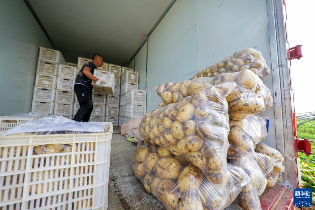 6月1日,農民在河北省玉田縣玉田鎮一處供京蔬菜基地內將收獲的馬鈴薯裝車(chē)。