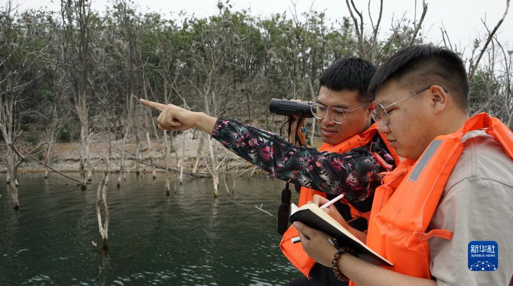 北京市水務(wù)局密云水庫管理處水生態(tài)管護員在觀(guān)察和記錄候鳥(niǎo)育雛情況(5月31日攝)。