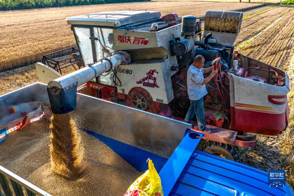 6月1日,在河南省三門(mén)峽市靈寶市西閻鄉西呂店村的麥田里,農機手操作大型收割機將小麥裝車(chē)(無(wú)人機照片)。