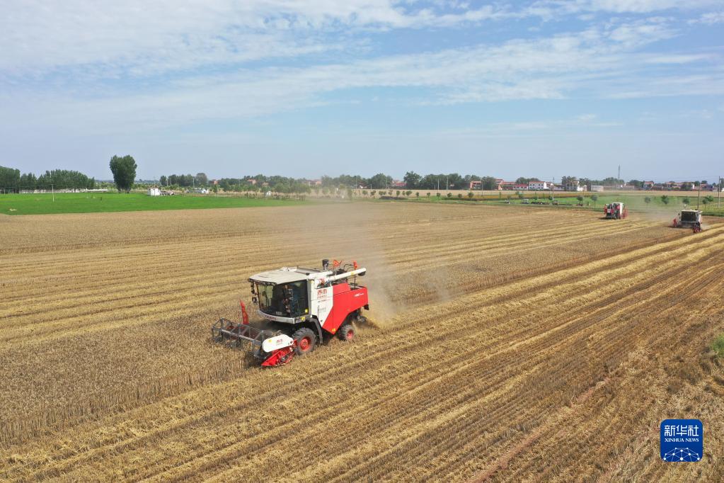 6月1日,河南省焦作市溫縣武德鎮徐堡村村民駕駛收割機在田間收小麥(無(wú)人機照片)。