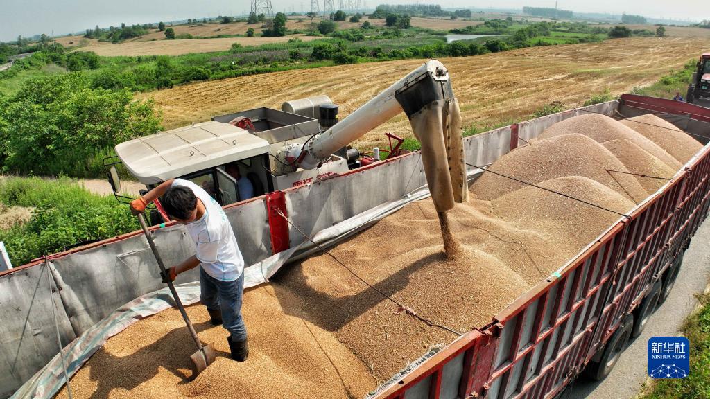 6月2日,在合肥市蜀山區小廟鎮段沖村,收割機將小麥裝車(chē)(無(wú)人機照片)。