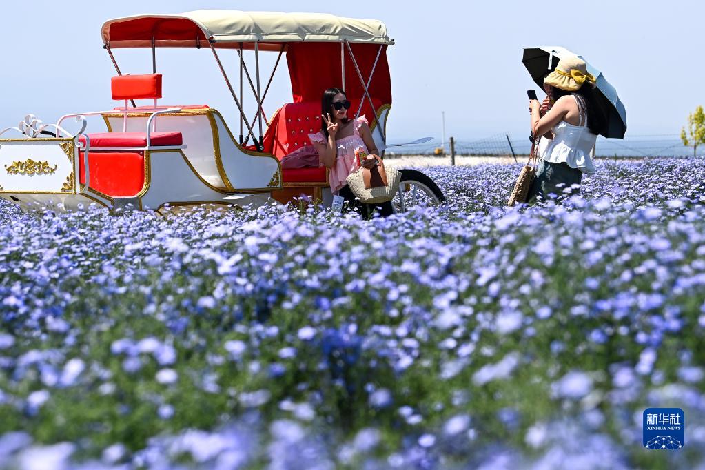 在新疆伊犁哈薩克自治州伊寧縣天山花海國家農業(yè)產(chǎn)業(yè)園,游客在花田里拍照(5月18日攝)。