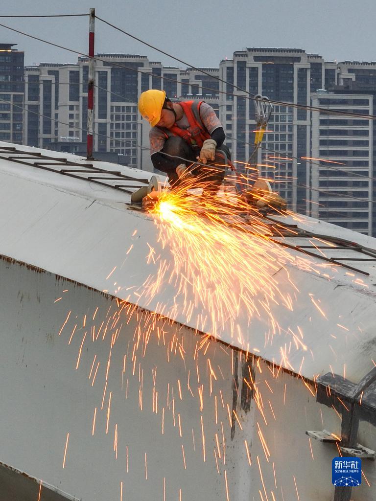 6月2日,中建三局的工程人員在南京梅苑南路跨秦淮新河大橋施工現場(chǎng)進(jìn)行焊接作業(yè)(無(wú)人機照片)。