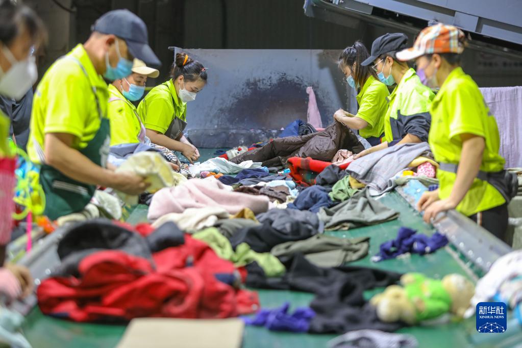 6月2日,工作人員在青島市可回收物綠色分揀中心織物分揀工作臺進(jìn)行分揀作業(yè)。