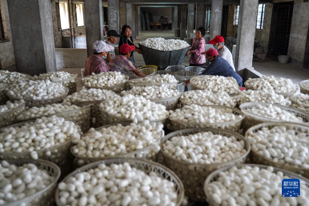 6月2日,工作人員在祝陽(yáng)鎮蠶繭站內分類(lèi)整理收購來(lái)的蠶繭。