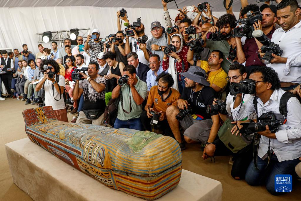5月27日,媒體記者在埃及塞加拉地區舉行的考古新聞發(fā)布會(huì )上拍攝一具彩繪木乃伊木棺。