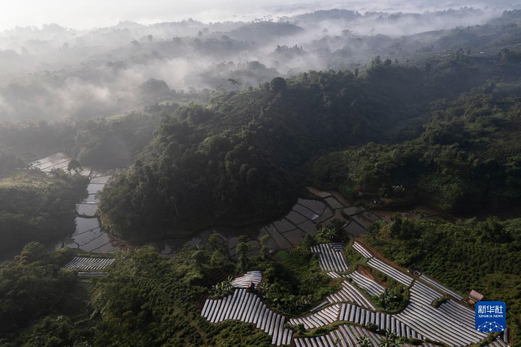 這是5月29日在印度尼西亞茂物航拍的茶園上方的晨霧。