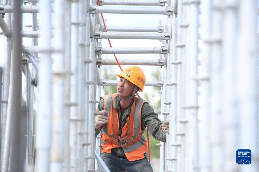 在伊春西站主體結構施工現場(chǎng),工人在建設作業(yè)(6月2日攝)。