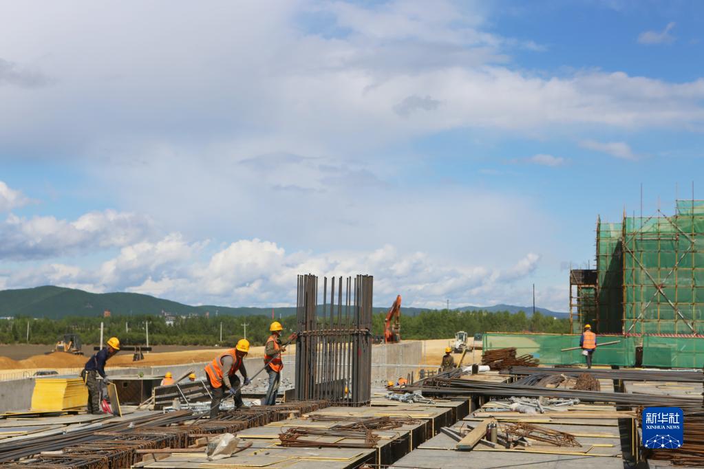 在伊春西站主體結構施工現場(chǎng),工人在建設作業(yè)(6月2日攝)。
