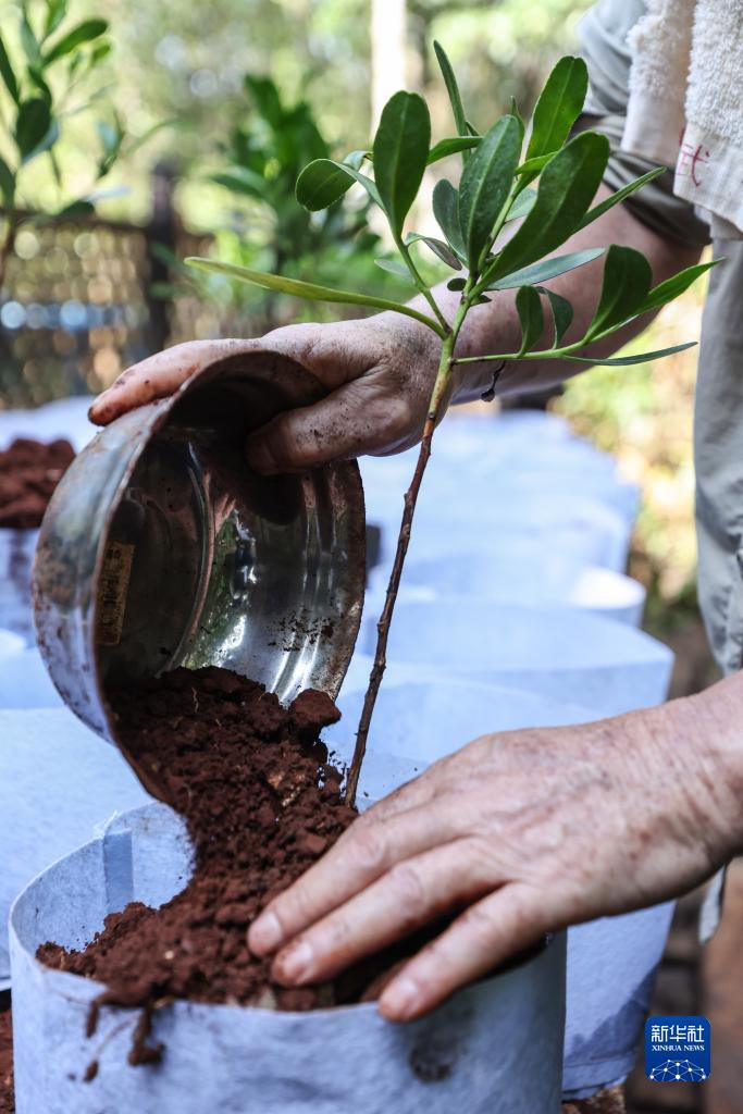6月2日,王式軍在海南東寨港國家級自然保護區的苗圃?xún)裙茏o紅欖李幼苗。