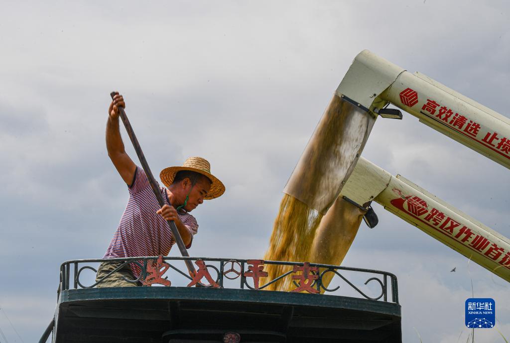 6月4日,在位于海南省東方市的海南農樂(lè )南繁科技有限公司制種基地,工人整理從收割機上卸下的稻種。