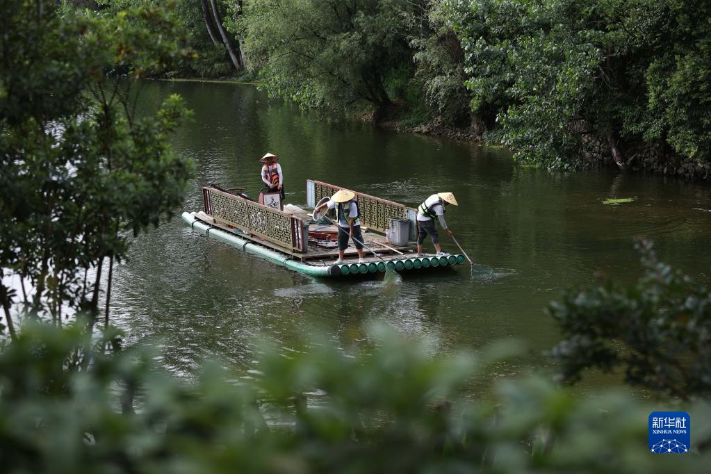 6月4日,在貴州省黔東南苗族侗族自治州丹寨縣萬(wàn)達小鎮東湖景區,志愿者在打撈景區湖面上的漂浮物。