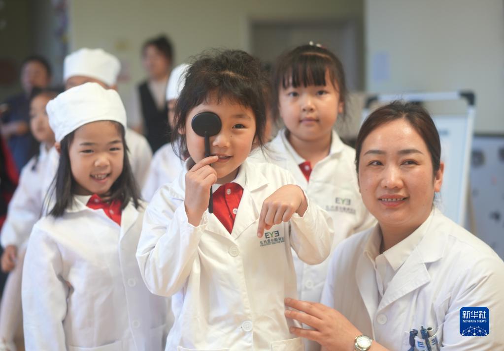 6月5日,浙江省湖州市長(cháng)興縣開(kāi)發(fā)區中心幼兒園,眼科醫生正在為孩子們檢查視力。