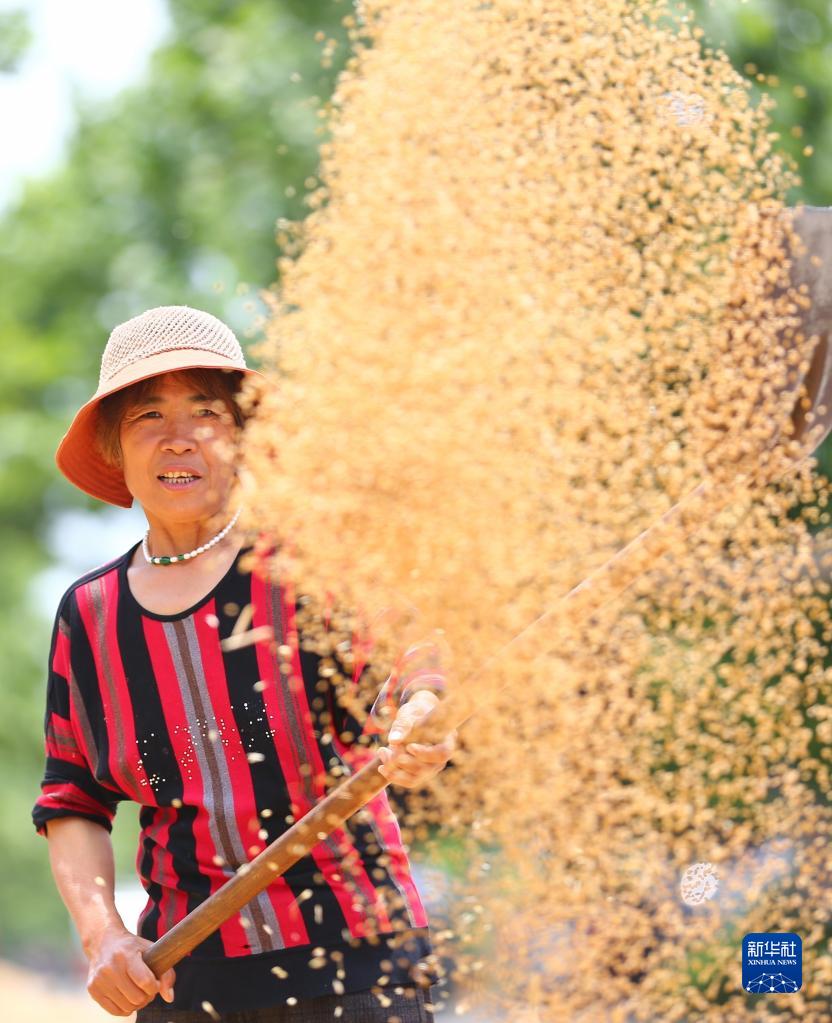 6月3日,在山東省滕州市鮑溝鎮圈里村,農民在揚曬收獲的小麥。