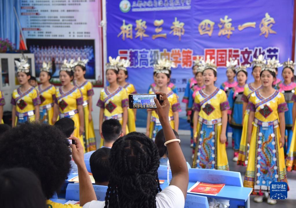 6月5日,來(lái)華留學(xué)生觀(guān)看三都高級中學(xué)學(xué)生演唱的水族語(yǔ)言歌曲《水歌》。