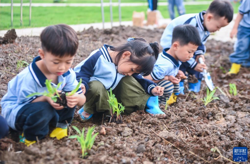 6月6日,孩子們在幼兒園的“農耕園”里跟著(zhù)老師一起種玉米苗。