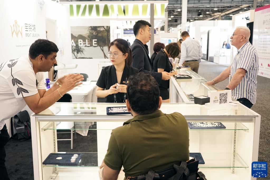 6月2日,在美國拉斯維加斯珠寶展上,珠寶業(yè)內人士參觀(guān)中國公司寶銳特的展區。