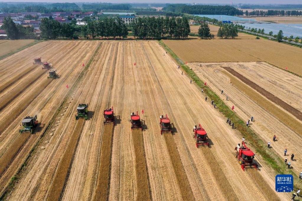 6月6日,農機手駕駛收割機進(jìn)行機收減損比武競賽(無(wú)人機照片)。