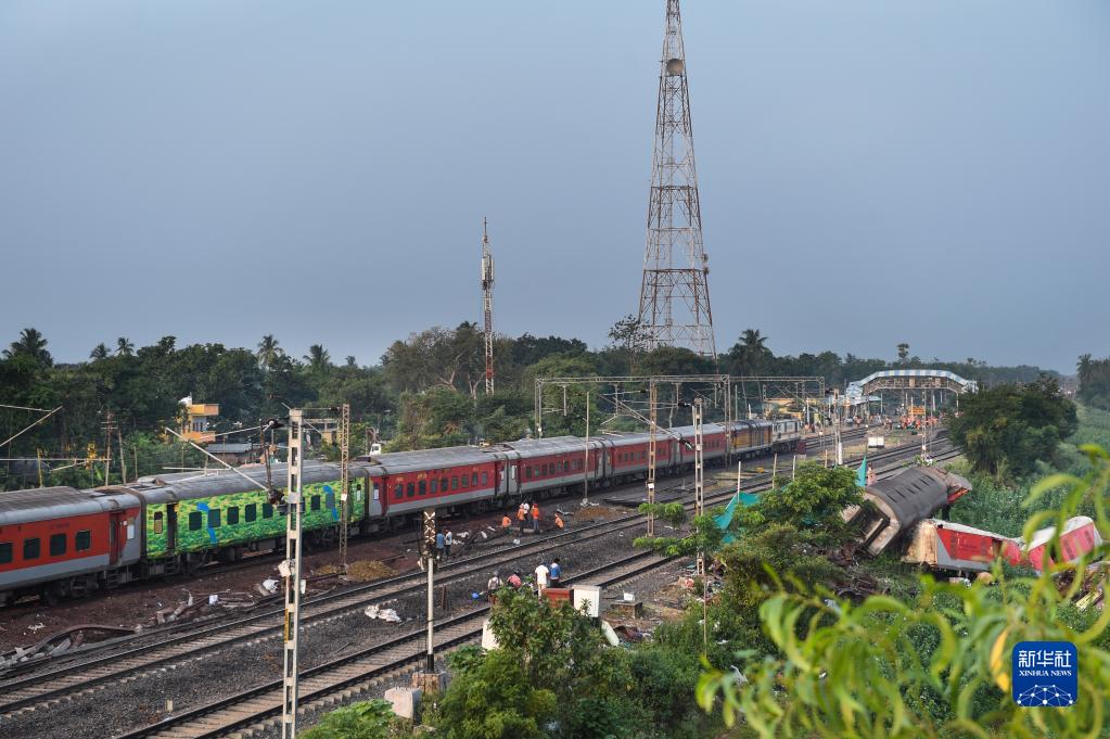 6月5日,在印度東部奧迪沙邦巴拉索爾地區,一列火車(chē)駛過(guò)列車(chē)相撞事故路段。