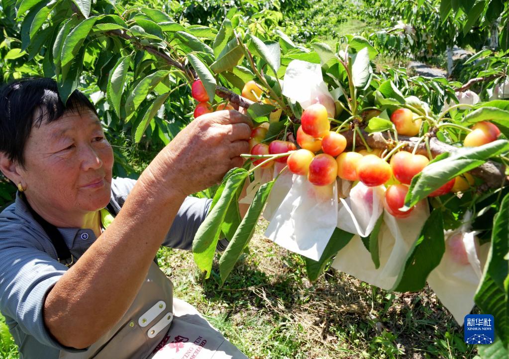 6月6日,秦皇島市山海關(guān)區石河鎮果農在管護套袋櫻桃。