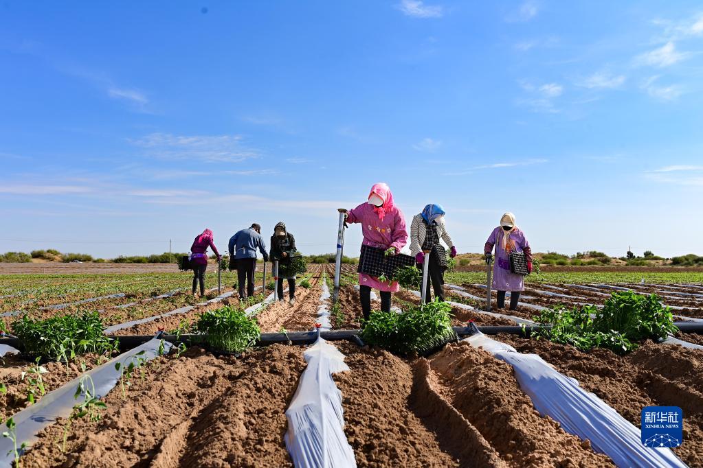 6月6日,農民在鄂托克前旗城川鎮麻黃套村的辣椒地里栽種辣椒苗。