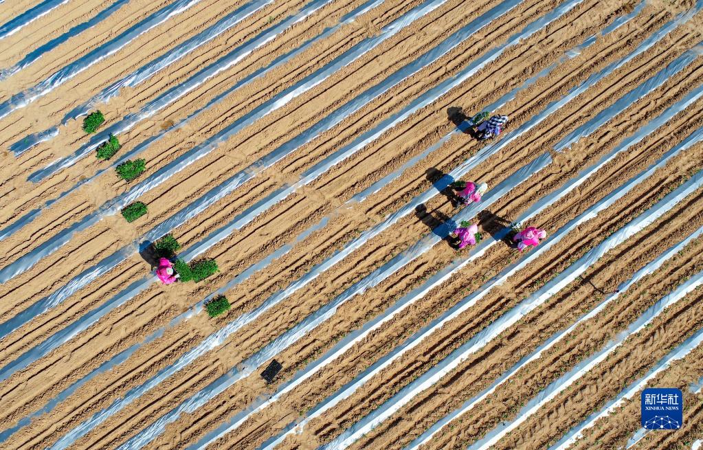 6月6日,農民在鄂托克前旗城川鎮麻黃套村的辣椒地里栽種辣椒苗(無(wú)人機照片)。