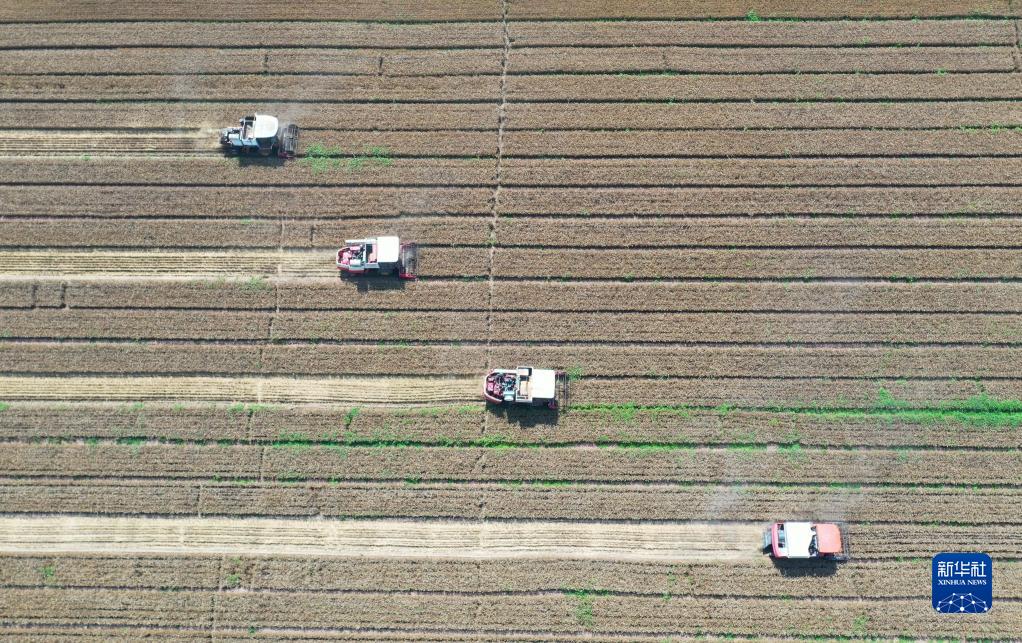 6月6日,在河南省安陽(yáng)市滑縣萬(wàn)古鎮,收割機在搶收種子田的小麥(無(wú)人機照片)。