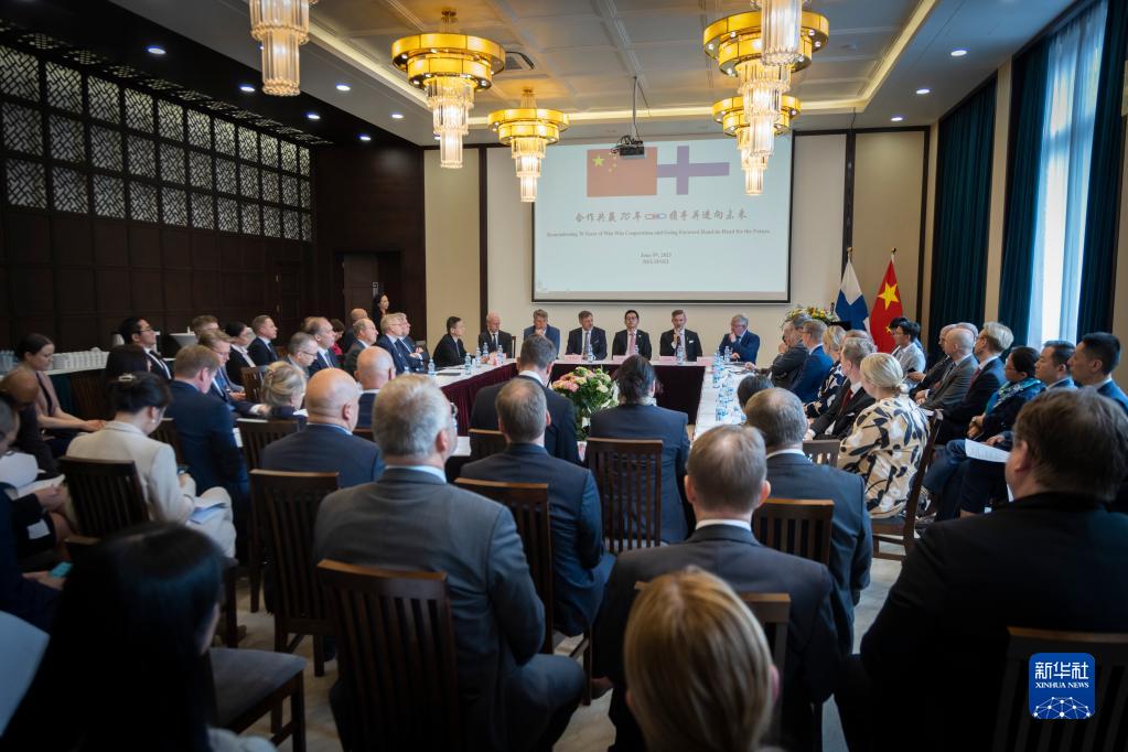 這是6月5日在芬蘭赫爾辛基拍攝的以“回顧中芬互利合作70年,攜手面向未來(lái)”為主題的研討與慶?;顒?dòng)現場(chǎng)。