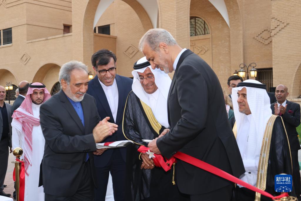 6月6日,在沙特阿拉伯利雅得,伊朗副外長(cháng)比格德利(前)、沙特副外交大臣優(yōu)素福(中)等出席伊朗駐沙特阿拉伯大使館復館儀式。