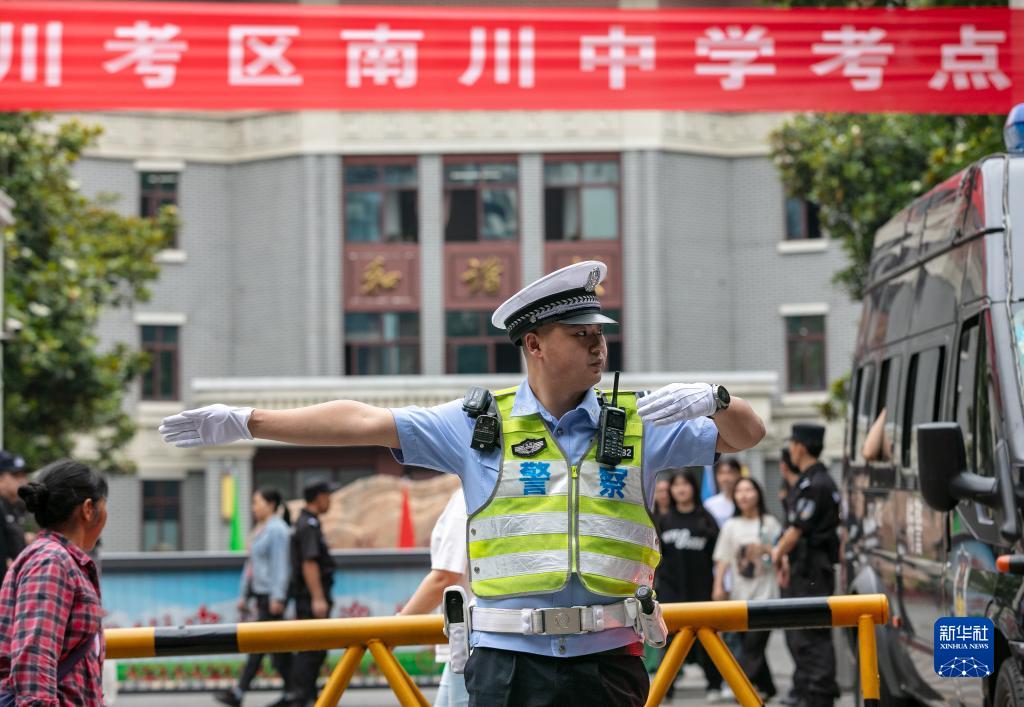 6月7日,在重慶市南川中學(xué)考點(diǎn)附近,警察指揮交通。