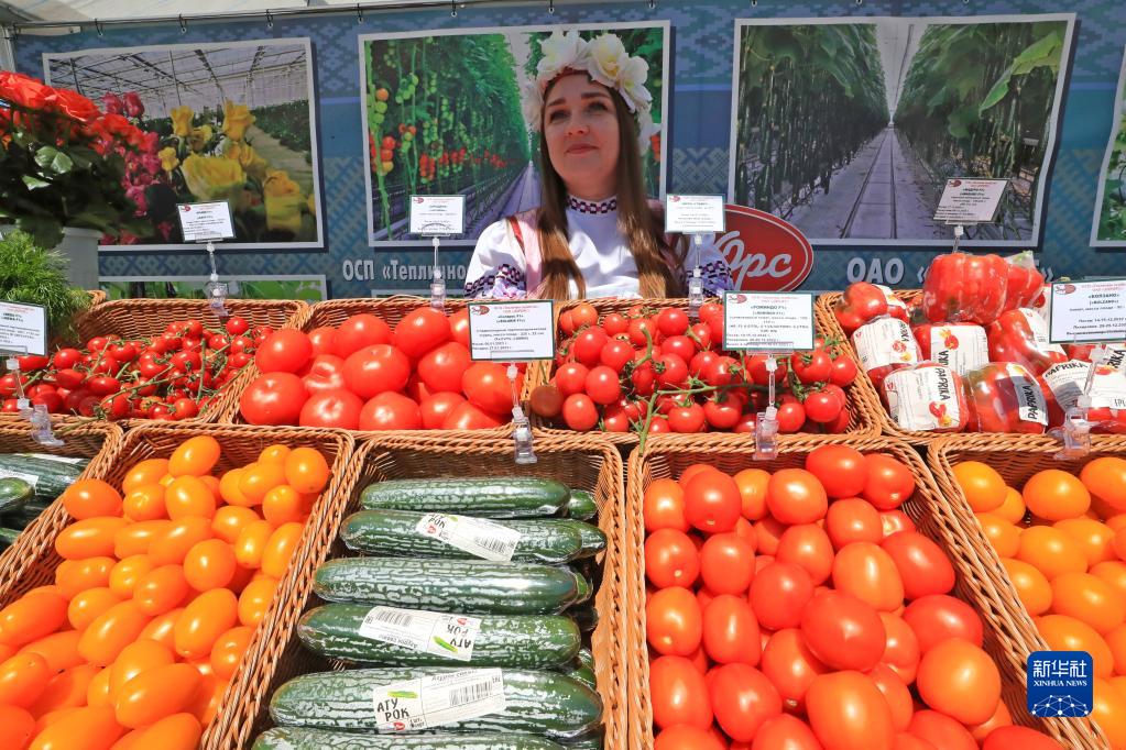 這是6月6日在白俄羅斯明斯克中白工業(yè)園拍攝的2023白俄羅斯國際農業(yè)展上的蔬菜展臺。