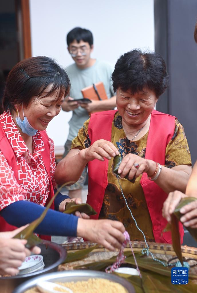 6月7日,在安華鎮球山村的愛(ài)心食堂里,志愿者在包粽子。