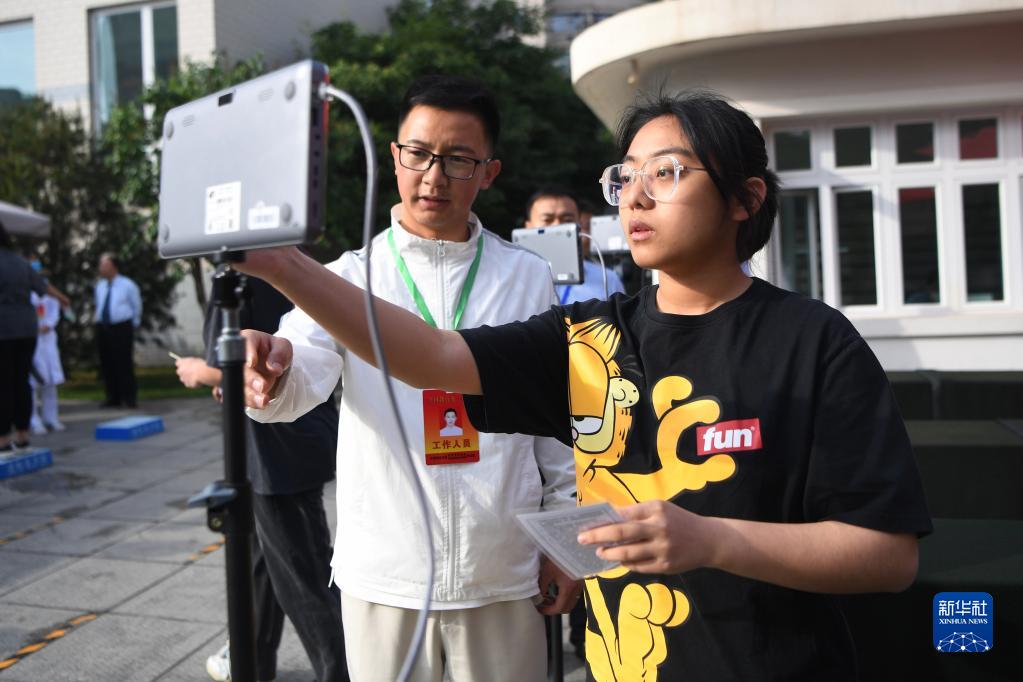 6月7日,在甘肅省蘭州市第十四中學(xué)考點(diǎn),考生刷身份證進(jìn)入考場(chǎng)。