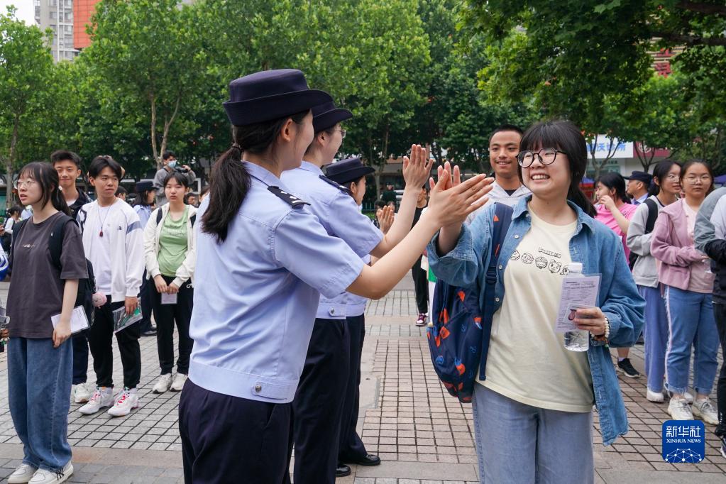 6月7日,在南京中華中學(xué)考點(diǎn),準備進(jìn)入考場(chǎng)的考生與執勤民警擊掌。