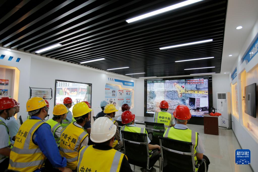 6月7日,在蘇州軌道交通8號線(xiàn)時(shí)代廣場(chǎng)站建設工地,建筑工人參加安全生產(chǎn)警示教育活動(dòng)。