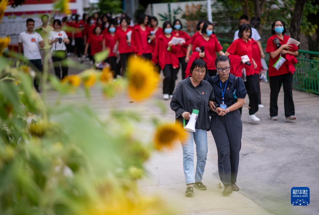 6月7日,張桂梅與走出考場(chǎng)的學(xué)生一起離開(kāi)考點(diǎn)。